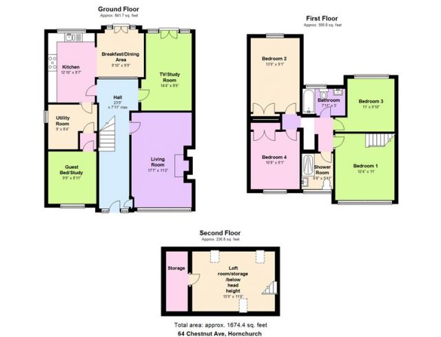 Loft Area: 15’9 x 11’6 max – A converted, carpeted space ideal as a playroom or just a huge storage space. There are three velux skylights letting in the natural light. At the peak of the roof, running the length of the room, the height is 6′, so just tall enough to stand through the centre length of this space.